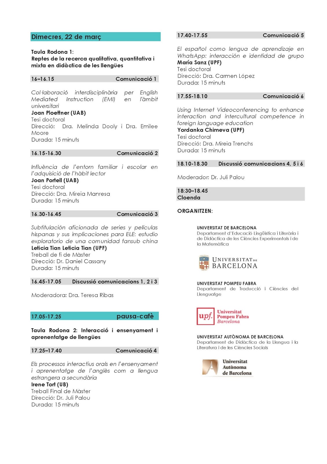Organitza: UB. Departament d’Educació Lingüística i Literària i de Didàctica de les Ciències Experimentals i de la Matemàtica. UPF. Departament de Traducció i Ciències del Llenguatge (Gr@el) Departament d’Humanitats (GREILI). UAB. Departament de Didàctica de la Llengua i la Literatura, i de les Ciències Socials