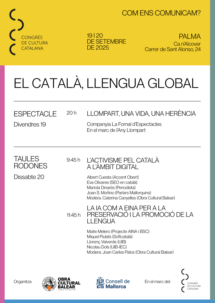 Jornades sobre llengua catalana: reptes de l’activisme digital i oportunitats de la IA Ca n’Alcover (Palma) serà l’escenari, els dies 19 i 20 de setembre, d’unes jornades dedicades a analitzar el paper de l’activisme digital i de la intel·ligència artificial en la defensa i difusió de la llengua catalana. El programa s’iniciarà divendres amb l’obra […]